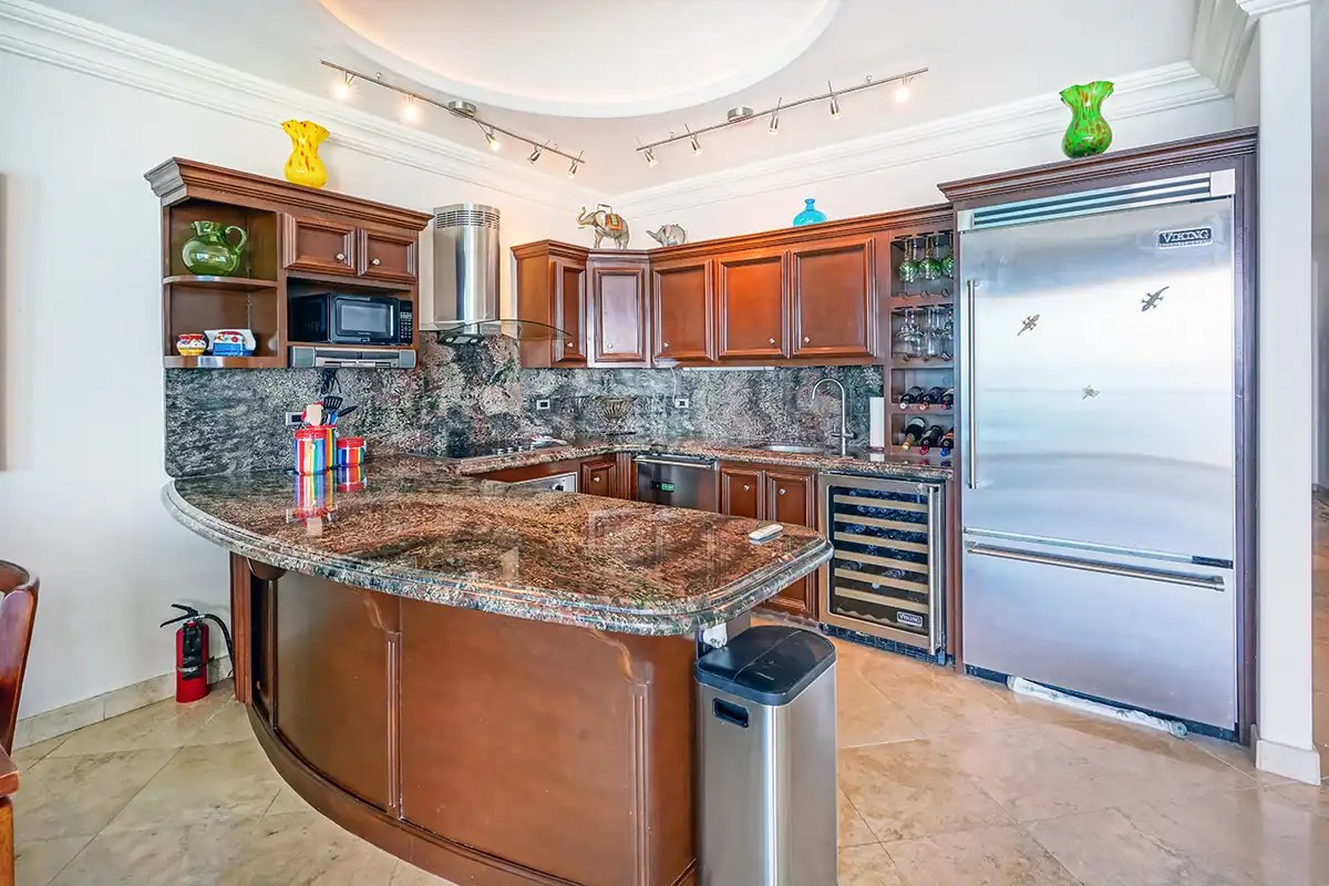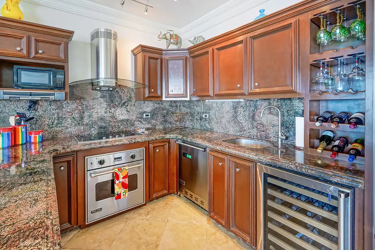 The Kitchen comes with stainless steel Viking appliances and enjoys beautiful ocean views. Also, find a high sitting dining table that sits 8 for your guests and family. Lots of cabinet space, granite countertops, a recessed ceiling, and a beautiful granite backsplash.