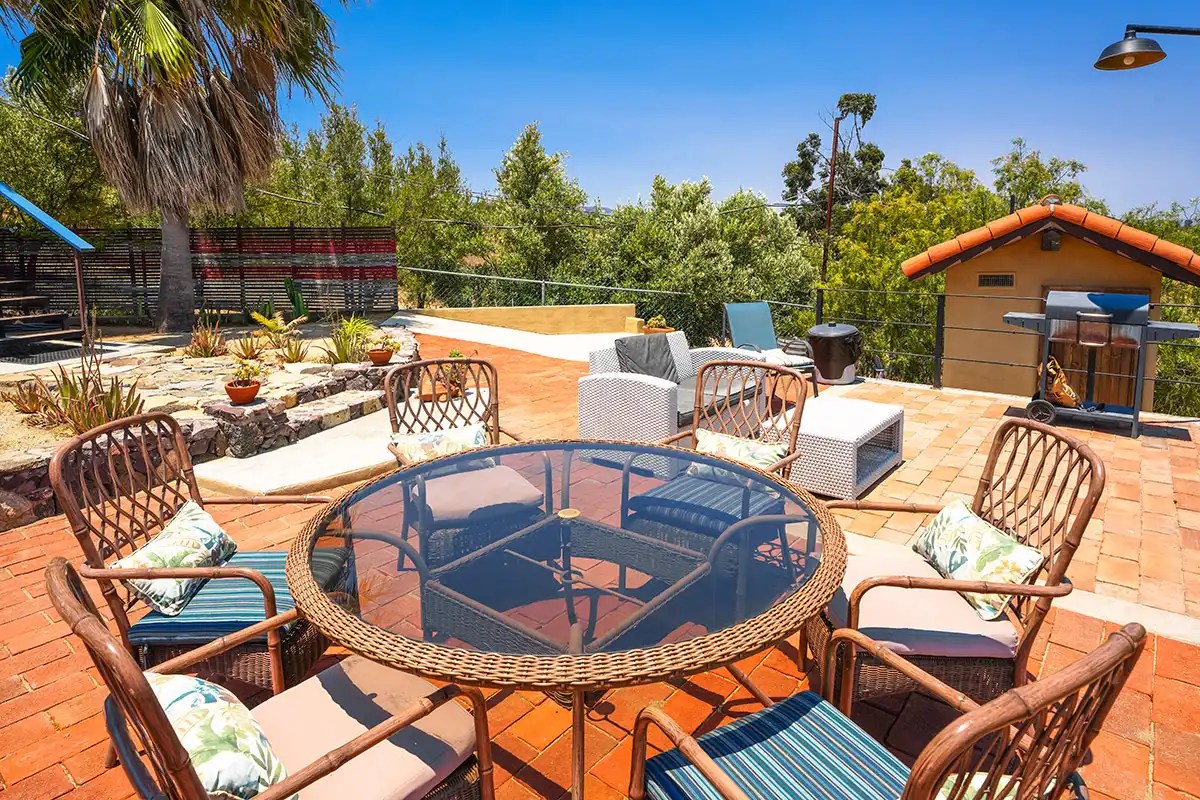 At the heart of Rancho Cien Piedras is its elegant event palapa and lushly landscaped gardens, offering a sophisticated setting for weddings, celebrations, or corporate retreats. Panoramic mountain and vineyard views create a breathtaking backdrop, while generous grounds allow for further expansion or custom event venues. The property’s tranquil orchard, with mature fruit trees yielding avocados, oranges, lemons, and peaches, adds color and charm—perfect for outdoor gatherings or strolls.