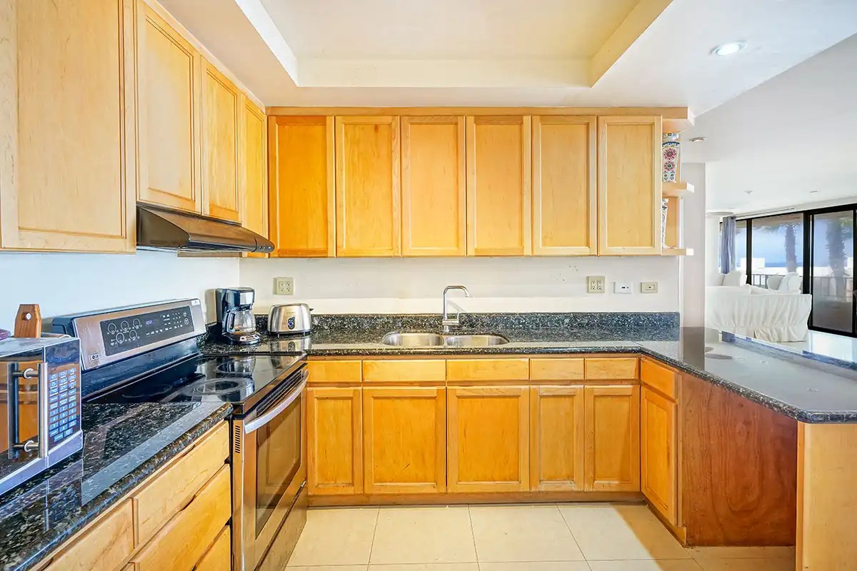 The Kitchen Area is spacious for you to cook and entertain your family and guests, it has lots of kitchen cabinet space, a refrigerator, stove, granite counter, and washer/dryer